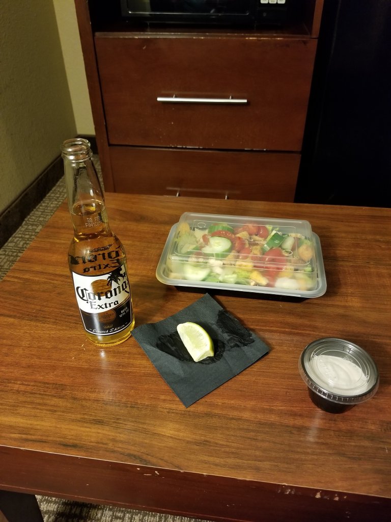 This is no ordinary Corona and salad. It is being enjoyed in a hotel room in Chicago. First beer since finishing my law school exams. I earned it.